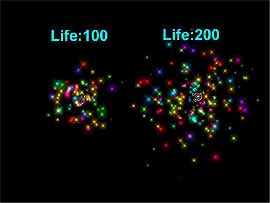 分子的參數由於分子參數眾多,無法一一介紹,在此挑選了幾項較為常用的參數為您說明。 變更 Life (生命) Life 值與畫格時間相關,它是控制每個分子顯示的時間。以 Life 值 100 為例,其分子顯示的時間長度到了 100 格前後時會消失,然後再重新從 Emitter 噴出,以此類推。以圖 23 來說明,左側的 Life 值為 100,右側為 200,其他的參數都相同;很明顯的右側分子活動的範圍較大,左側的分子的運動時間只有 100格,時間到就消失了;右側的時間為 200 格,相較於 Life 值 100,右側的 Emitter 有較長的運動距離。