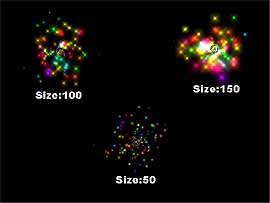 變更 Size (大小) Size 指的是 Emitter 噴出的分子顆粒尺寸。圖 24 是選用了「Super Colorful」Emitter,第一個 Emitter 的 Size 屬性為預設值 100 (左一),第二個 Emitter 調為 50 (中間),第三個則調為 150(右一)。