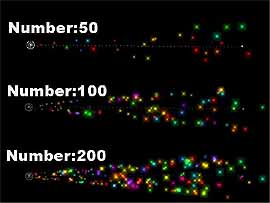 變更 Number (數量) Number 指的是Emitter 噴出的分子顆粒數量,圖25同樣選用「Super Colorful」Emitter,第一個Number值調為50(上方),第二個 Emitter 的 Number 屬性為預設值100(中間),第三個 Emitter 調為 200(下方)。從圖中您可以看出Emitter 所噴出的分子較稀疏,數值越高者越密。