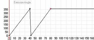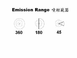 Emission Range 及 Emission Angle 一樣可以設定 Emitter 的噴射範圍及方向的動畫。您可將 Emission Angle 或設成如圖 30 圖示視窗,就是畫面 40 格時設為 360,畫面 41 設為 0,畫面 80 時設為 360。執行後您會看到火花 360 度旋轉,圖 31。