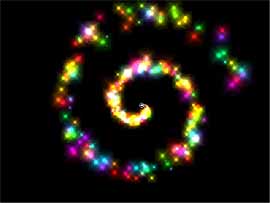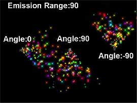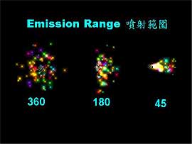 變更 Emission Range (噴射範圍) 顧名思義就是用來設定Emitter噴射範圍,我們先加入「Super Colorful」Emitter 到舞台中,我們先來看看 Emission Range 的值為何? 預設值為 360 (向四面八方噴射),現在我們將它向下拖曳到 90 的地方,請注意看舞台 Emitter 的變化,從左到右分別為 360、180 及 45 度,如圖 27。現在我們來執行看看其結果,如圖28。