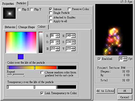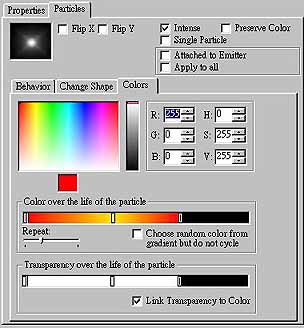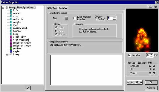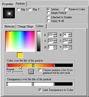 如果您想變更火花顏色或分子噴射的顆粒,可以在 Emitter 屬性對話方塊中來改變。首先在舞台中加入「Heavy Fire Sparkles」Emitter,在Emitter 上按下右鍵,在出現的快顯選項清單中選取「Properties」,按下後畫面上會出現「Emitter Properties」對話方塊,如圖 32。在對話方塊中按下「Particles」標籤,再點選「Colors」標籤,如圖 33。 在這個方塊中您會看到二個顏色漸層列,我們來看看彩色的漸層列所代表的意義,漸層列上面有三個方框,表示目前分子使用的顏色。最左邊方框為紅色,代表分子產生時的顏色;中間方框為橘黃色,表示分子生命中途的顏色;最右方框為紅色,表示分子在結束之後變成紅色。