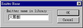 首先在舞台上已經有一個您自訂的 Emitter,在 Emitter 上按下右鍵,在開啟的快顥選項清單中點選「Add to Library」,如圖 40,它會出現「Emitter Name」方塊,請鍵入名稱,如圖 41,按下「OK」按鈕後,它會被放置在資料庫視窗中目前被選取的 Emitter 所在的資料夾內,如圖 42。