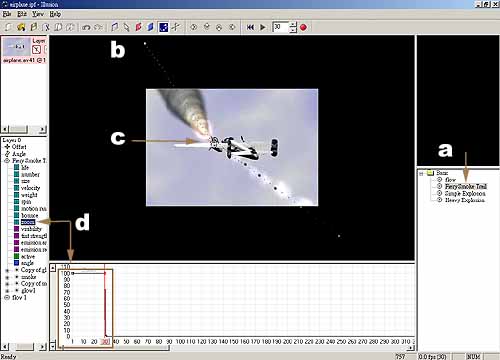 7a 及 7b。 最後將整段動畫輸出為影片,我只有輸出二秒的時間。因為當場景中的煙塵與爆炸消散後,飛機還在 – 因為在 trueSpace 中我並未將飛機分解或隱藏起來。 我們輕易的就在 illusion 中完成了一段爆破的動畫。