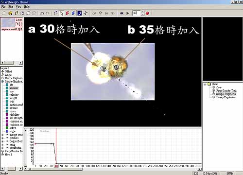 圖 7 1. 分別在畫面第 30 格於左側機翼上及 35 格於右側機翼加入二個不同的爆炸Emitter : Simple Explosion與Heavy Explosion。如圖