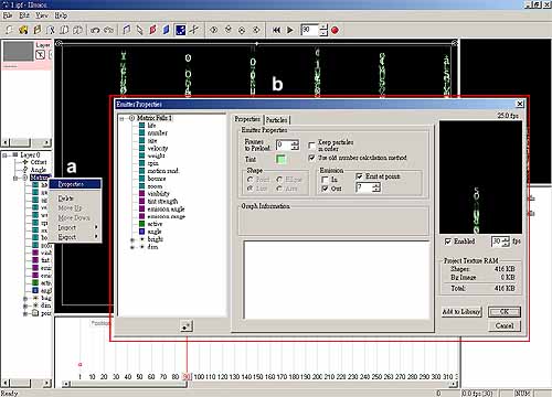 圖 3 1. 在階層視窗中的 Matrix Falls 上按下滑鼠右鍵,於快顯功能表中選擇 Properties,如圖 3a;可開啟 Emitter Properties 對話框,如圖 3b。