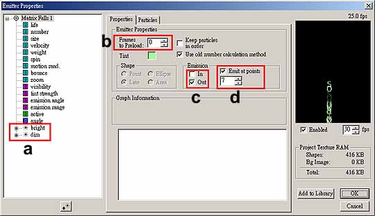 圖 4 2. 由對話框中我們可以看出 Matrix Falls 一共有二種分子 : Bright 與 Dim,如圖 4a。前者較為明亮且速度較慢,而後者速度較快且顏色較為淡一點。