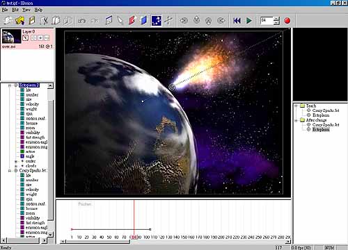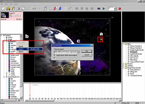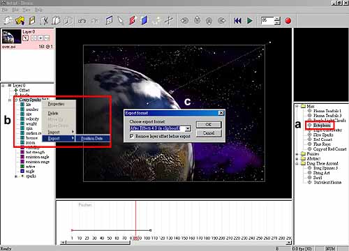圖 7 複製路徑 9. 因為 Ectoplasm 的部分要與 Crazy Sparks Jet 1 的動畫路徑相同。請將畫格調至第 1 格,然後在 Crazy Sparks Jet 1 按下滑鼠右鍵選擇 Export>>Position Data,如圖 7b。此時會出現 Export format 對話方塊,再選擇 After Effects 4.0 (to clipboard) 按下OK,如圖 7c。 請注意 : 此時會將 Crazy Sparks Jet 1 的關鍵畫面及位置都暫存在剪貼簿 (Clipboard) 中。在 illusion 中,若是要將 Emitter 複製相同路徑的話,可以使用此方法。 10. 點選 Library Window 的 Ectoplasm,並在畫面的隨意一處點一下,如圖 8a。將滑鼠移到 Hierarchy Window 的 Ectoplasm 2 按下滑鼠右鍵選擇 Import>>Position Data,如圖 8b;此時會出現 Import format 對話方塊,再選擇 After Effects 4.0 (to clipboard) 按下 OK,如圖 8c,如此一來Ectoplasm 2 便會跟著 Crazy Sparks Jet 1 的路徑走。
