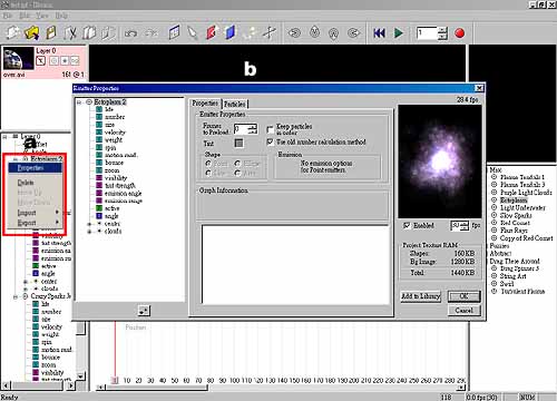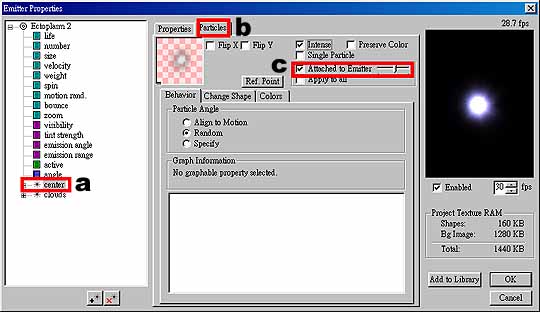 圖 9 12. Ectoplasm 是由二組分子 center 及 clouds 所構成的,點選其中的 center,如圖 10a,並將 Particle 標籤的 Attached to Emitter 選項打勾,此時會出現一個調整器,將它調到大約中間的部分,如圖 10b 及 c;按下 OK 撥放一次看看,這時感覺是不是好了一點?
