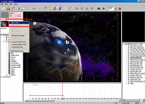 衝擊波1. 當彗星撞擊的時候,我們可以加入一段衝擊波,以增加視覺的張力,所以就必須要再加入一個環狀的分子,但是找來找去,就是找不到適合的分子,怎麼辦呢?那當然只好自己做囉!其實自己創造一個分子也不是那麼難,也是一樣,依據自己所需的去改變參數即可。 2. 首先,請先增加一層 Layer 為 Layer 1,如圖 12a。因為到時我們波形是傾斜的橢圓形,所以會改變角度,然後在畫格 105 時撞擊的地方加入 corona 的分子此時的大小請隨意變更,因為我們會再修改,如圖 12b。