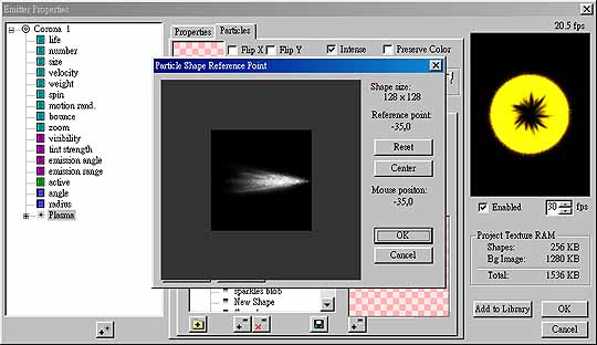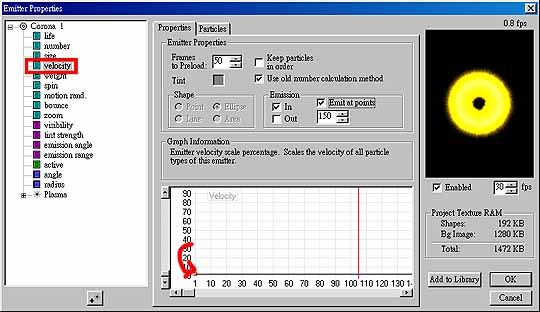 圖 14 4. 接下來選擇 velocity 將其調整至接近 0,這樣子它就不會旋轉了,如圖 14,然後選擇 number,把它調至 30,然後再點選 Corona 1下的 plasma 並將 Particle的 Attached to Emitter 選項打勾,將它調到最右邊,再按下 Change Shape 選擇 whoopsmall,再按下 Make Active,將原本的分子圖置換,然後再按下 Ref.Point去更改分子圖的中心點,如圖15。