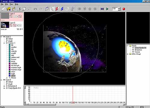 圖 16 6. 好了!現在只要把分子加入動畫中就好囉!不過我們要先改變一下 Layer 1 的角度,點選 Angle 調至 -35,然後再將 corona 移回原來的位置!將畫格移至 130,並改變圓周大小將其調到最大,如圖 17。