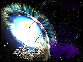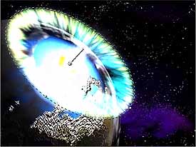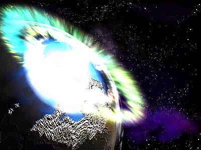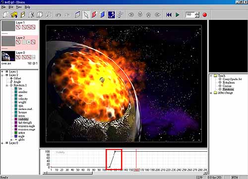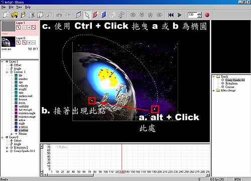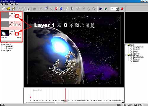 圖 22 : 衝擊波完成圖 被摧毀的地球1. 可憐的地球,被撞擊之後,開始被火焰吞蝕….我們現在就來製作被火焰吞蝕的地球吧!先新增一層 Layer,並按下滑鼠右鍵選擇 Move Down 將它置在衝擊波的圖層下,因為現在的分子數太多,預覽時會花很多時間,所以新增一層圖層,只要顯示新圖層的分子就好,按下 Layer 0 及 Layer 1 旁的〝*〞圖形,會出現紅色斜線,預覽時就不會出現 Layer 0 及 Layer 1 的分子了,如圖 23。