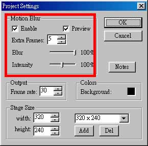 圖 21 : 啟動動態模糊 9. 接下來只要點選分子,去做複製,並在其他畫格貼上幾個,再依照自己所需的去調整細部,並點選工具列上的 Project settings,Project settings 對話方塊出現後,將 Motion Blur 的 Enable 打勾,我們將啟動動態模糊,然後將 Extra Frames 改成 5,如圖 21,按下 OK,衝擊波的部份就算完成了,如圖 22。