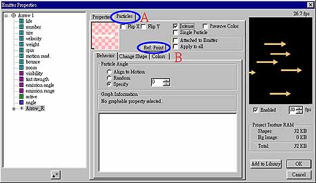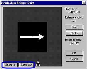 首先場景中增加一 "Arrow",然後在該 Emitter 上按滑鼠右鍵,調整其屬性,如圖 2,然後點選「Ref. Point」會開啟「Particle Shape Reference Point」視窗,如圖 3,有時後﹙圖 3-A﹚「Zoom In」、「Zoom Out」按鈕不是很明顯,但功能仍然存在。