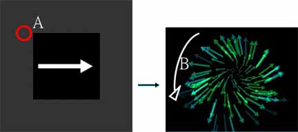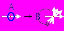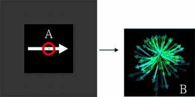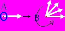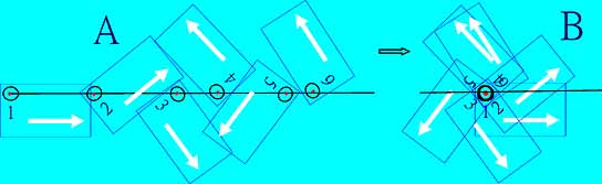 原理很簡單,Emitter 是以參考點往外隨機噴射,參考點就是圓心,噴射起始就給了一個方向,在圖 9A 我們給予噴射 6 次來分析,參考點應該在同一圓心點,我們先暫時將之拉開放在同一線上;方便標出位置所以「參考點和箭頭」都用一長方形框線表示相關位置。