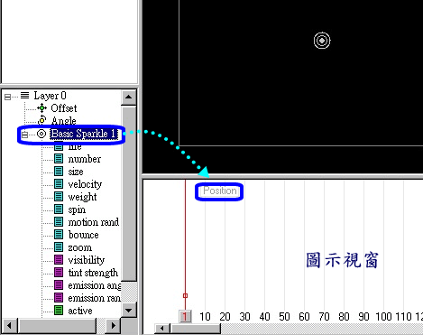 1. Position﹙移動路徑﹚Position參數為控制Emitter在「舞台視窗」中的位置,不同格數給予不同位置,這就形成了移動路徑。 Position參數在「階層視窗」中,點選Emitter的名稱,在「圖示視窗」可見到有Position字樣,這時就可作進階調整了。﹙如圖 1﹚