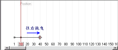 6. 如何增加格數在路徑中一格代表 1/30 秒,想要將整個路徑、或某 2 個「關鍵畫格」之間的時間拉長或縮小要如何完成? 本例中第 2「關鍵畫格」和第 3「關鍵畫格」中間隔 10 格,也就是 1/3 秒﹙圖 10﹚,現在這 2 個「關鍵畫格」要增加時間,移動較慢些,例如將 10 格增加到 30 格。
