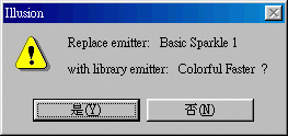 然後在「舞台視窗」中,該 Emitter 上按滑鼠右鍵,會彈出一快顯功能表,請選擇 "Replace",如圖 16。 再來會有一警告視窗,詢問是否真的要將 "Basic Sparkle" 換成 "Colorful Faster",請回答「是(Y)」,如圖17。