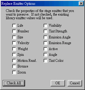 再來有「Replace Emitter Option」視窗出現,詢問新 Emitter 要不要繼承舊的屬性,有很多核示方塊選擇;亦或按「Check All」鈕,選擇全部,如圖18。 最後一個視窗是詢問?要不要變更名字,按「OK」就大功告成,如圖19。