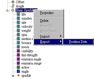 8. 有沒有將路徑存檔的功能?有沒有類似巨集功能,只要將路徑資料存檔,以後該路徑可給任何檔案的Emitter使用?有! 1. 只要在「階層視窗」中於該 Emitter 名稱處,點選滑鼠右鍵,然後於快顯功能表中選擇「Export/Position Data」,如圖 20。