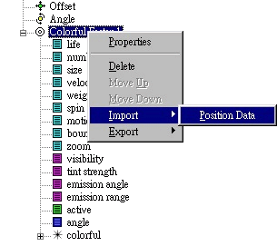 3. 上面步驟完成後,在 illusion 中新增一個舞台,舞台中加一 Emitter,可放於任何位置。 4. 現在我們必須將適才儲存的檔案載入進來,使 Emitter 運動路徑和以前的一模一樣,請於 Emitter 名稱處點選滑鼠右鍵,然後「Import>Position Data」,如圖22。