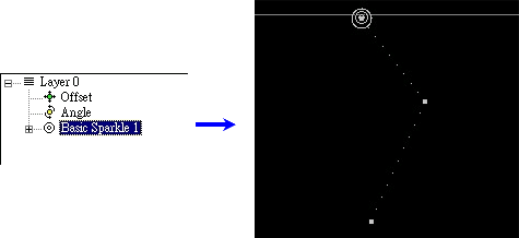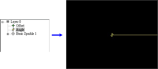 ※ 利用此種方式可將 illusion 效果與 After Effects 相容,只要在「Import」或「Export」選擇 "After Effects" 格式即可。 9. 路徑旋轉如果要將路徑旋轉要如何完成?很簡單利用 Layer 的「Angle」的參數即可。 1. Layer 有 2 個參數,分別是「Offset」、「Angle」調整後,影響範圍是 Layer 上的所有 Emitter,假使您只想旋轉其中一個 Emitter,技巧上您必須將該 Emitter 單獨放在另一個 Layer 上。 2. 接下來,於「階層視窗」中選擇「Angle」,Angle 內定值是 "0",如圖24。