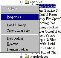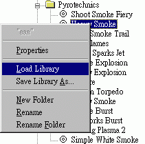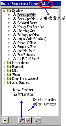 新增、刪除 Emitter,必須在資料庫屬性視窗中處理,同樣的於快顯功能表中選「Properies」,如圖 7。或是於 Emitter 資料庫區雙擊滑鼠鍵﹙Double Click﹚,也可以將 Properties 視窗開啟。 之後會開啟 Emitter 的屬性視窗,最左方為 Emitter 的樹狀結構,下方有 2 個小按鈕分別為,「新增 Emitter」、「刪除 Emitter」;值得注意的是新增 Emitter,並不是增加一個空的 Emitter,而是複製所選擇的 Emitter,然後我們再就這個 Emitter 作一些細部修改,所以形同一個新的,如圖 8。
