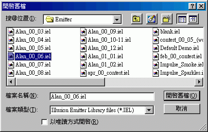 所以 illusion 中最小單位為 Particle、其次 Emitter、最大是資料庫。 一個資料庫,最少要有一個目錄,所以不論如何殺目錄,最後一個目錄無法刪除。 一個目錄中至少有一個 Emitter,該目錄下 Emitter 不論如何刪除,最後一個 Emitter 無法刪除;例外情形是有數個目錄存在時,刪除目錄,其內含 Emitter 亦隨之刪除了。 一個 Emitter 內含至少一個 Particle,不論如何,剩下最後一個 Particle 無法刪除。 2. 如何載入資料庫在軟體光碟片中有 2 個目錄 "Emitter"、"Emitter_for_V2",放了各式各樣的特效資料庫,其中 "Emitter_for_V2" 只能給 illusion2.0.0 以上版本使用。 如何載入資料庫,首先在「資料庫視窗」按滑鼠右鍵,於快顯功能表中選擇「Load Library as...」,然後有「開啟舊檔」視窗出現,請選擇 "Alan_00_06.iel" 檔案。如圖 1及圖 2。