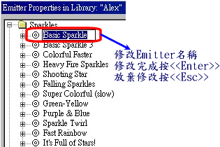 在 Emitter 屬性視窗中,也可以修改 Emitter 名稱,滑鼠在 Emitter 上點一下表示 "選擇了這個 Emitter",在已經選擇的 Emitter 上再按一下滑鼠就進入 "修改名稱" 模式,如圖 9。 ※ 若是滑鼠快速雙擊﹙Double Click﹚表示展開 Emitter 的參數值。 |