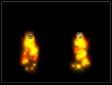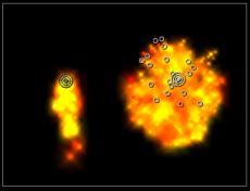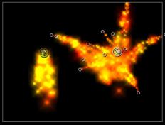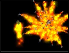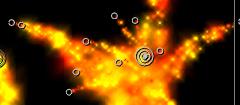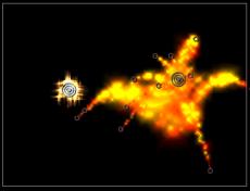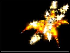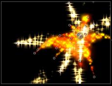 請注意:在目前的範例中,超級發射器內僅有一組自由發射器,所以您可能會認為調整超級發射器屬性 (如 velocity),與調整自由發射器屬性 (如 f-velocity),效果會是接近的。但若是超級發射器之下有二組或以上的自由發射器,意義就完全不同了。『因此超級發射器的屬性是整體的,對其所噴發出的自由發射器都有所影響;而自由發射器屬性僅對本身這一組有所影響。』 您可以瞭解到這些屬性彼此間互相的影響。事實上,若是您希望改變分子可見性的話,已超級發射器而言,有好幾種表現的方法:分子型態可見 (Particle type visibility)、自由發射器可見 (free emitter visibility)、超級發射器可見 (super emitter visibility) - 它們都可以影響到最終的可見性。 超級發射器的噴射角度 (emission angle) 與噴射範圍 (emission range),此二屬性並未特別的提及。您可能會猜想其作用: 控制被噴發出自由發射器。沒錯。與傳統發射器的控制一般,控制超級發射器噴發的範圍與角度,只不過噴發出的是自由發射器。 新加入一組自由發射器如同傳統發射器可以由數個分子型態構成,超級發射器亦可以由數個自由發射器構成,到目前為止我們的超級發射器都僅有一組自由發射器 - 現在我們將加入另一組自由發射器。 回到畫格 1,原本有兩組 "Heavy Fire Sparkles",刪除掉其中一組傳統的發射器 (原本在舞台左邊的),然後在舞台中加入一組 "Simple Sparkles" 發射器,在畫格第 45 格時所看到的效果如圖 12。