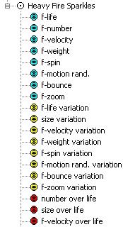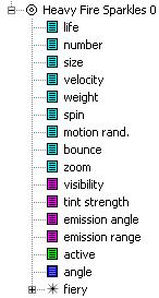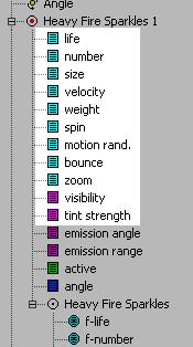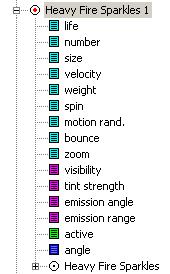 左側的圖 4 為傳統的發射器,超級發射器為右側的圖 5。您可以發現二者間僅有微小的差異,超級發射器的圖示上中心位置有一紅色小點,並在圖 5 底部原本為分子型態的位置,現在為自由發射器,其圖示的中心位置有一黑色小點。按下 "Heavy Fire Sparkle" 前方的 "+" 圖示,可展開自由發射器的屬性: