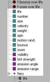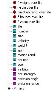 請注意:自由發射器並沒有 f-size 的屬性,對於自由發射器而言,尺寸的變化並沒有影響。 請注意:下面的 "variation (變異)" 屬性可讓自由發射器行進時速度的變化,生命週期的屬性有著差異的變化...等。"over life" 屬性直接控制自由控制器 f-屬性的生命週期間的變化。 請注意:您或許發現,部分的階層視窗中屬性項目並沒有 "f-" 的字首,如 "size variation"、"number over life" 與 "size over life",這些屬性對於自由發射器並沒有作用,但是對於其所噴發出的分子有所影響。