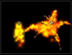 我們已經將其轉換為超級發射器,其本身並不會產生分子,而是產生自由發射器 (free emitter),後再經由這些自由發射器產生分子,這是一個很重要的概念。您可以發現經由這些自由發射器所產生的分子,其行為如同數個傳統的發射器運動時所產生的分子一般。在下圖中的小圓圈為自由發射器,是從超級發射器中噴發出來的。