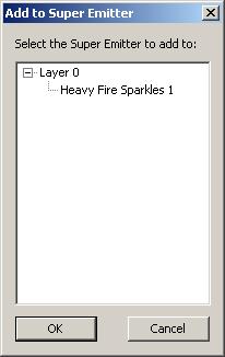 在階層視窗中的 "Simple Sparkles" 的發射器上按下滑鼠右鍵 (與先前製作超級發射器的步驟相同),從開啟的快顯清單中選擇 "Add to Super Emitter (新增至超級發射器)",將會開啟一個對話框,其中顯示目前專案中所有的超級發射器,如圖 13。