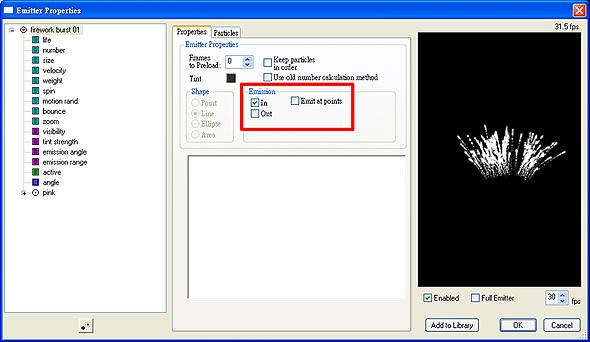 6. Emitter 是向上下噴發的,從屬性面板中設定 Emission In 跟