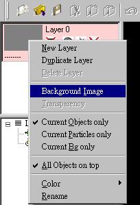 Layer0 設定背景1. 目前僅有一層圖層 Layer0,我們為 Layer0 設定一張背景影像。請在 particleIllusion 桌面左上角的 Layer0 的位置上按下滑鼠右鍵,從快顯清單中選擇 Background,如圖 1。