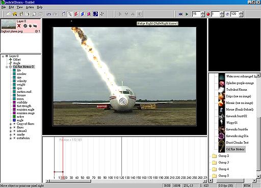 Layer0 加入 Emitter接著為目前的背景加入發射器 (Emitter) 的效果,我們假設有一個隕石從天上落下來擊中飛機,產生連鎖的爆炸。這段動畫很簡單,當作順便複習一下 particleIllusion 內 Emitter 的動畫技巧。 3. 在畫格 1 時加入 Emitter: Oil Fire Meteor,畫格 15 時移動到飛機中心的位置,畫格 15 時的影像如圖 3。