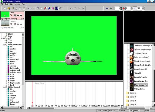 7. 設定 Layer1 的背景影像,如圖 7。這張影像與 Layer0 的飛機是相同的,不過將飛機以外的部位去背成綠色。 此時應可發現 Layer1 上完全看不到 Emitter 的圖示,因為 Emitter 是在 Layer0 之上,在 particleIllusion 中每一圖層的 Emitter 編輯時都是獨立的,所以目前的 Layer1 上看不到任何的 Emitter。