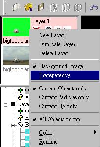 Layer1 設定透明度目前 Layer1 的背景影像完全的覆蓋在 Layer0,接下來我們要將 Layer1 背景影像的綠色部分去掉。 8. 在 particleIllusion 的左上角的 Layer1 上按下滑鼠右鍵,並從快顯清單中選擇 Transparency,如圖 8。