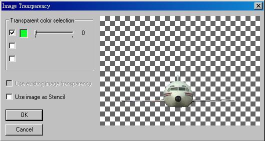 9. 接著會開啟 Image Transparency 面板,從 Transparency color selection 可選擇三種顏色去背。此處核取第一個選項,並點一下旁邊的色塊,此時滑鼠指標會變成滴管的形狀,點取背景影像綠色的部位,綠色就會被指定透明。一旁的拉桿可以設定擴大相似的程度,如圖 9。 請注意:若是您的影像是製作成帶有 Alpha Channel 的 Targa 檔案的話,直接核取 Use existing image transparency 即可。