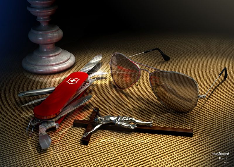 聚光燈2盞,投影有清晰模糊變化為表現重點,此外光線照耀紅色瑞士刀身反光渲染紅色至燈台座,為球形燈布投影的補光太陽眼鏡框架上也有紅光面在表面擴散。