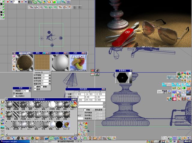 底材質為玻璃下壓編織纖維布,所以影子投影和物件有5mm距離的原因,瑞士刀體用多層材質設定,鏡子 +