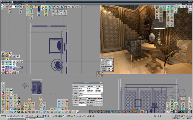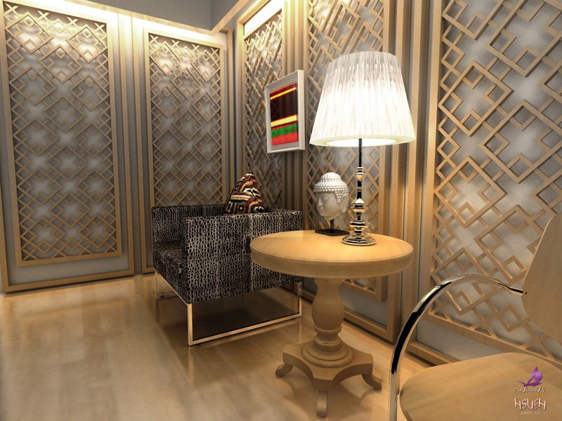 名稱: 餐廳客座區 製作軟體: truespace7.5 說明: 人工光和自然光的配合運用。 Vary運算:泛光燈1盞、區域光3盞。 •算圖時間1小時27秒