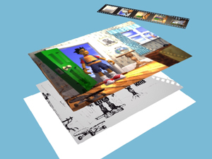 Using a 2D package we can layer different images and text, and we can the same in trueSpace Illustrator, e.g. we can use trueSpace Illustrator to produce true 3D text. The separate elements can be combined in 3D or in 2D, whichever is fastest and most convenient.