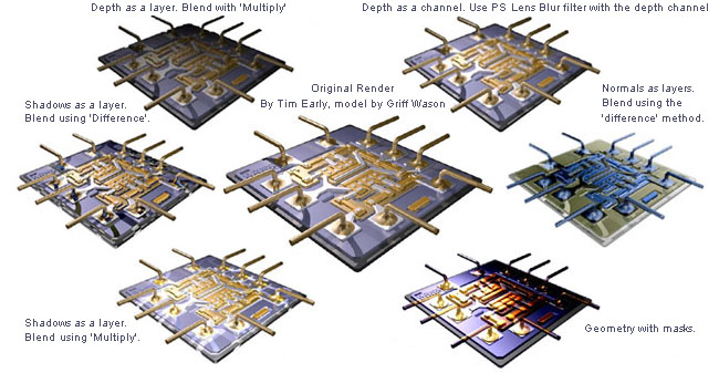 | 現在您可以改變光源來源的強度,建立或編輯景深、霧氣、深度提示、produce cutaways,還有許多的特效輸出成 Photoshop 階層,在此無法一一說明,與您所擁有的 2D 繪圖軟體完美的整合在一起,不需要重複著色! 你可以看下面流程圖: | ||||||||||||||||||||||||