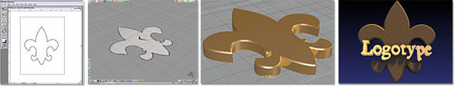 | trueSpace 可以讓您匯入與匯出若干向量檔案格式,包含 AI、EPS 與其他的格式,可以讓您從 Adobe Illustrator、CAD 軟體、Macromedia Freehand...等軟體中匯入到 trueSpace 內工作。如下圖所示,您可以先行繪製一個商標的輪廓,匯入到 trueSpace 中利用延展工具產生 3D 的立體造型,賦予寫實的材質與貼圖,然後著色輸出。您也可以著色輸出為向量的檔案格式,全方位的支援美術設計人員的工作。 | ||||||||||||||||||||||||