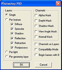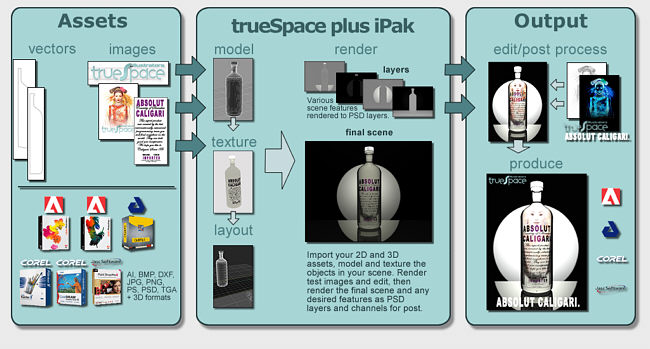 就跟你在本網頁看到的範例一般,你也可以藉由下載二個PSD檔,可以清楚讓您了解其特點與功能。該 PSD 檔案是 trueSpace 的場景經由 iPak 外掛著色後輸出的,下載連結如下: 點選此處下載 PSD 檔案與場景範例 - 由 Paul Ashington 與 Paul Woodward 製作 (約 3Mb)