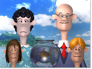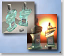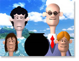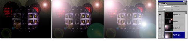 輸出至圖層使用 iPak for trueSpace,大多數場景中的著色效果,如反射、光線、物件以及許多的效果都可以產生 Photoshop PSD 的檔案格式,您可以使用 2D 編輯軟體處理 Adobe Photshop 的檔案,包括 Adobe Photoshop 與 Photoshop Elements, Jasc Paint Shop Pro...等軟體。 下面的範例顯示了數種不同分別著色的效果 (結合在一個藍色漸層的背景中),以及最後合成的影像。這樣的設計可以讓你變換反射、折射、反光等等,不用再到 trueSpace 全部重新著色。 |