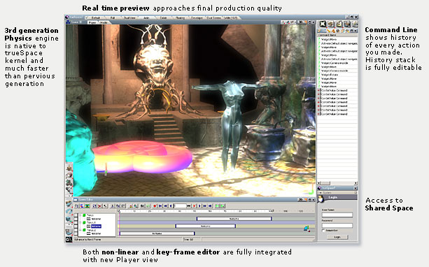 進入 trueSpace 中體驗 3D 動畫的樂趣,您將會發現透過 trueSpace 製作動畫,是件簡單又充滿樂趣的事。 在 trueSpace7 擬真即時的工作空間內,非線性編輯器、IK與骨骼系統現在可以和程序化動畫與動態模擬結合,並且支援完整的編輯模式。